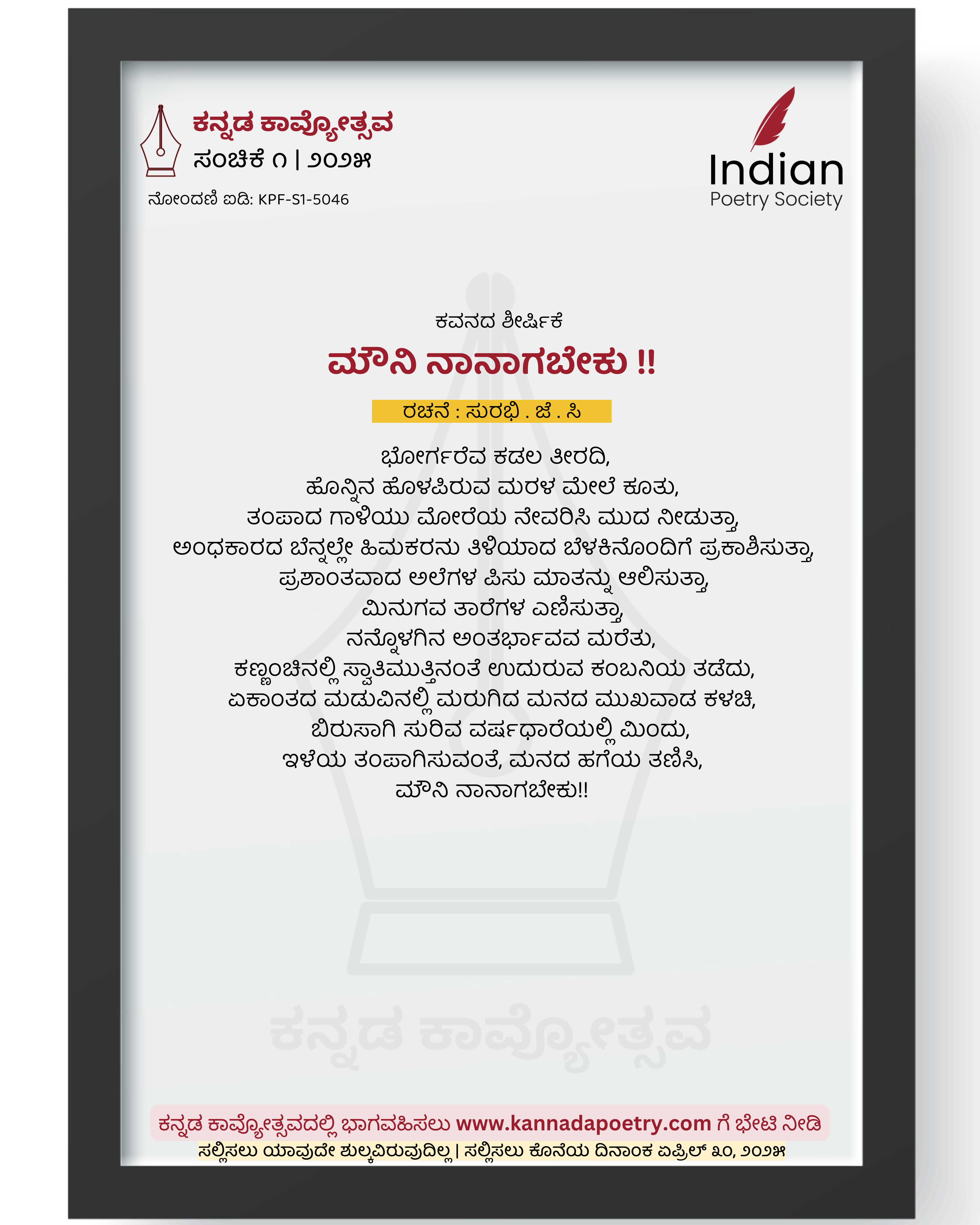 ಭೋರ್ಗರೆವ ಕಡಲ ತೀರದಿ, ಹೊನ್ನಿನ ಹೊಳಪಿರುವ ಮರಳ ಮೇಲೆ ಕೂತು, ತಂಪಾದ ಗಾಳಿಯು ಮೋರೆಯ ನೇವರಿಸಿ ಮುದ ನೀಡುತ್ತಾ, ಅಂಧಕಾರದ ಬೆನ್ನಲ್ಲೇ ಹಿಮಕರನು ತಿಳಿಯಾದ ಬೆಳಕಿನೊಂದಿಗೆ ಪ್ರಕಾಶಿಸುತ್ತಾ, ಪ್ರಶಾಂತವಾದ ಅಲೆಗಳ ಪಿಸು ಮಾತನ್ನು ಆಲಿಸುತ್ತಾ, ಮಿನುಗವ ತಾರೆಗಳ ಎಣಿಸುತ್ತಾ, ನನ್ನೊಳಗಿನ ಅಂತರ್ಭಾವವ ಮರೆತು, ಕಣ್ಣಂಚಿನಲ್ಲಿ ಸ್ವಾತಿಮುತ್ತಿನಂತೆ ಉದುರುವ ಕಂಬನಿಯ ತಡೆದು, ಏಕಾಂತದ ಮಡುವಿನಲ್ಲಿ ಮರುಗಿದ ಮನದ ಮುಖವಾಡ ಕಳಚಿ, ಬಿರುಸಾಗಿ ಸುರಿವ ವರ್ಷಧಾರೆಯಲ್ಲಿ ಮಿಂದು, ಇಳೆಯ ತಂಪಾಗಿಸುವಂತೆ, ಮನದ ಹಗೆಯ ತಣಿಸಿ, ಮೌನಿ ನಾನಾಗಬೇಕು!!