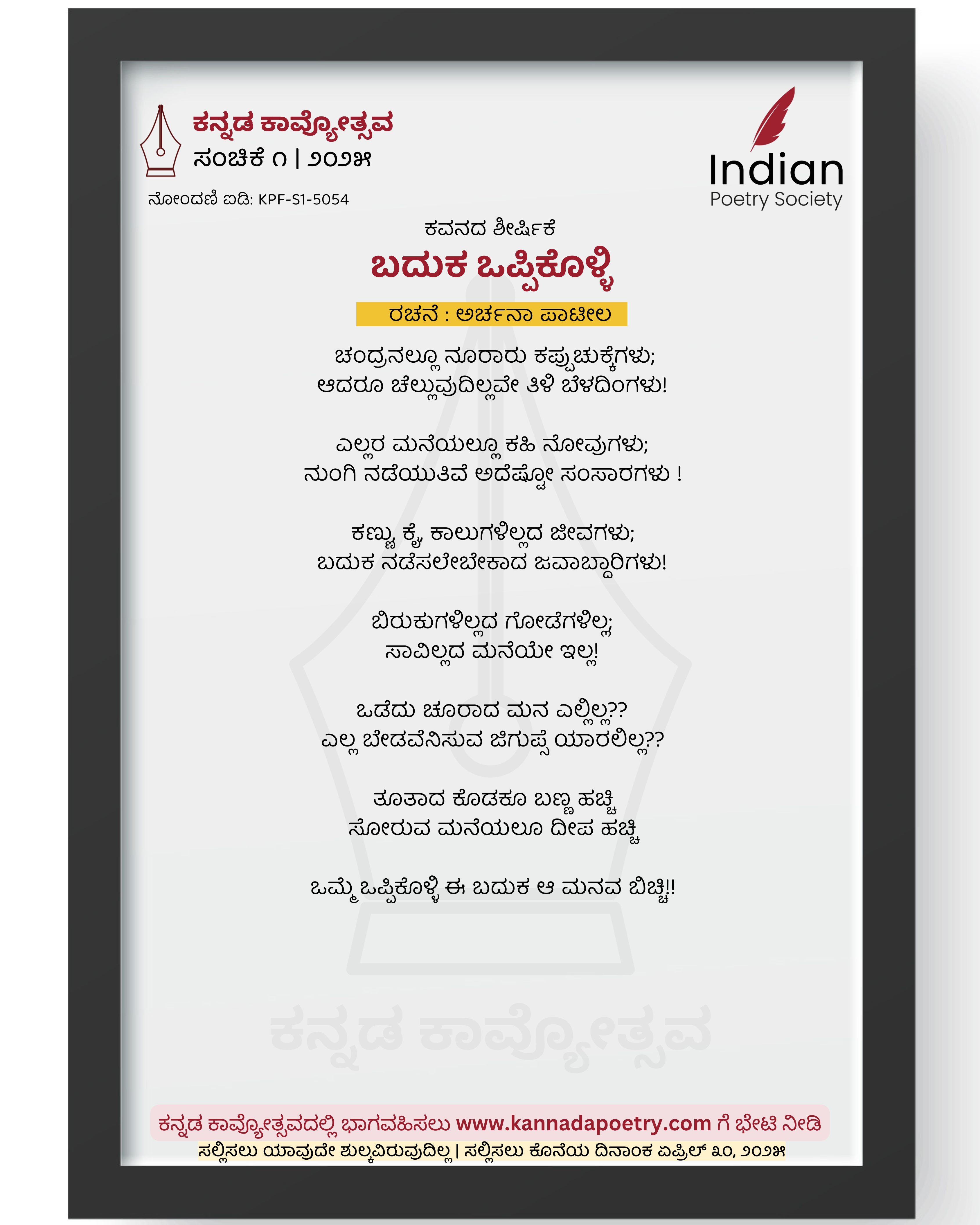 ಚಂದ್ರನಲ್ಲೂ ನೂರಾರು ಕಪ್ಪುಚುಕ್ಕೆಗಳು; ಆದರೂ ಚೆಲ್ಲುವುದಿಲ್ಲವೇ ತಿಳಿ ಬೆಳದಿಂಗಳು! ಎಲ್ಲರ ಮನೆಯಲ್ಲೂ ಕಹಿ ನೋವುಗಳು; ನುಂಗಿ ನಡೆಯುತಿವೆ ಅದೆಷ್ಟೋ ಸಂಸಾರಗಳು ! ಕಣ್ಣು, ಕೈ, ಕಾಲುಗಳಿಲ್ಲದ ಜೀವಗಳು; ಬದುಕ ನಡೆಸಲೇಬೇಕಾದ ಜವಾಬ್ದಾರಿಗಳು! ಬಿರುಕುಗಳಿಲ್ಲದ ಗೋಡೆಗಳಿಲ್ಲ; ಸಾವಿಲ್ಲದ ಮನೆಯೇ ಇಲ್ಲ! ಒಡೆದು ಚೂರಾದ ಮನ ಎಲ್ಲಿಲ್ಲ?? ಎಲ್ಲ ಬೇಡವೆನಿಸುವ ಜಿಗುಪ್ಸೆ ಯಾರಲಿಲ್ಲ?? ತೂತಾದ ಕೊಡಕೂ ಬಣ್ಣ ಹಚ್ಚಿ ಸೋರುವ ಮನೆಯಲೂ ದೀಪ ಹಚ್ಚಿ ಒಮ್ಮೆ ಒಪ್ಪಿಕೊಳ್ಳಿ ಈ ಬದುಕ ಆ ಮನವ ಬಿಚ್ಚಿ!!