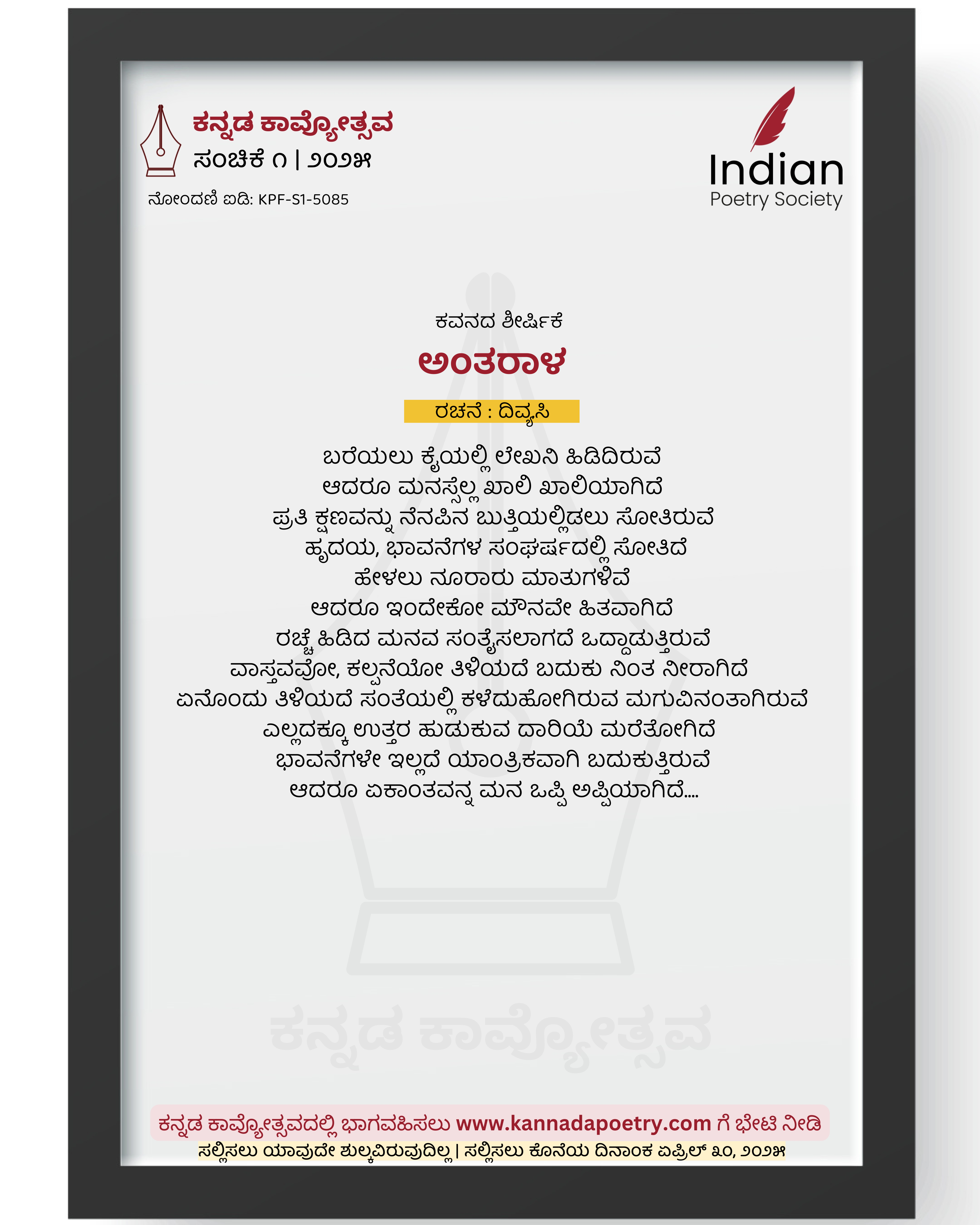 ಬರೆಯಲು ಕೈಯಲ್ಲಿ ಲೇಖನಿ ಹಿಡಿದಿರುವೆ ಆದರೂ ಮನಸ್ಸೆಲ್ಲ ಖಾಲಿ ಖಾಲಿಯಾಗಿದೆ ಪ್ರತಿ ಕ್ಷಣವನ್ನು ನೆನಪಿನ ಬುತ್ತಿಯಲ್ಲಿಡಲು ಸೋತಿರುವೆ ಹೃದಯ, ಭಾವನೆಗಳ ಸಂಘರ್ಷದಲ್ಲಿ ಸೋತಿದೆ ಹೇಳಲು ನೂರಾರು ಮಾತುಗಳಿವೆ ಆದರೂ ಇಂದೇಕೋ ಮೌನವೇ ಹಿತವಾಗಿದೆ ರಚ್ಚೆ ಹಿಡಿದ ಮನವ ಸಂತೈಸಲಾಗದೆ ಒದ್ದಾಡುತ್ತಿರುವೆ ವಾಸ್ತವವೋ, ಕಲ್ಪನೆಯೋ ತಿಳಿಯದೆ ಬದುಕು ನಿಂತ ನೀರಾಗಿದೆ ಏನೊಂದು ತಿಳಿಯದೆ ಸಂತೆಯಲ್ಲಿ ಕಳೆದುಹೋಗಿರುವ ಮಗುವಿನಂತಾಗಿರುವೆ ಎಲ್ಲದಕ್ಕೂ ಉತ್ತರ ಹುಡುಕುವ ದಾರಿಯೆ ಮರೆತೋಗಿದೆ ಭಾವನೆಗಳೇ ಇಲ್ಲದೆ ಯಾಂತ್ರಿಕವಾಗಿ ಬದುಕುತ್ತಿರುವೆ ಆದರೂ ಏಕಾಂತವನ್ನ ಮನ ಒಪ್ಪಿ ಅಪ್ಪಿಯಾಗಿದೆ....