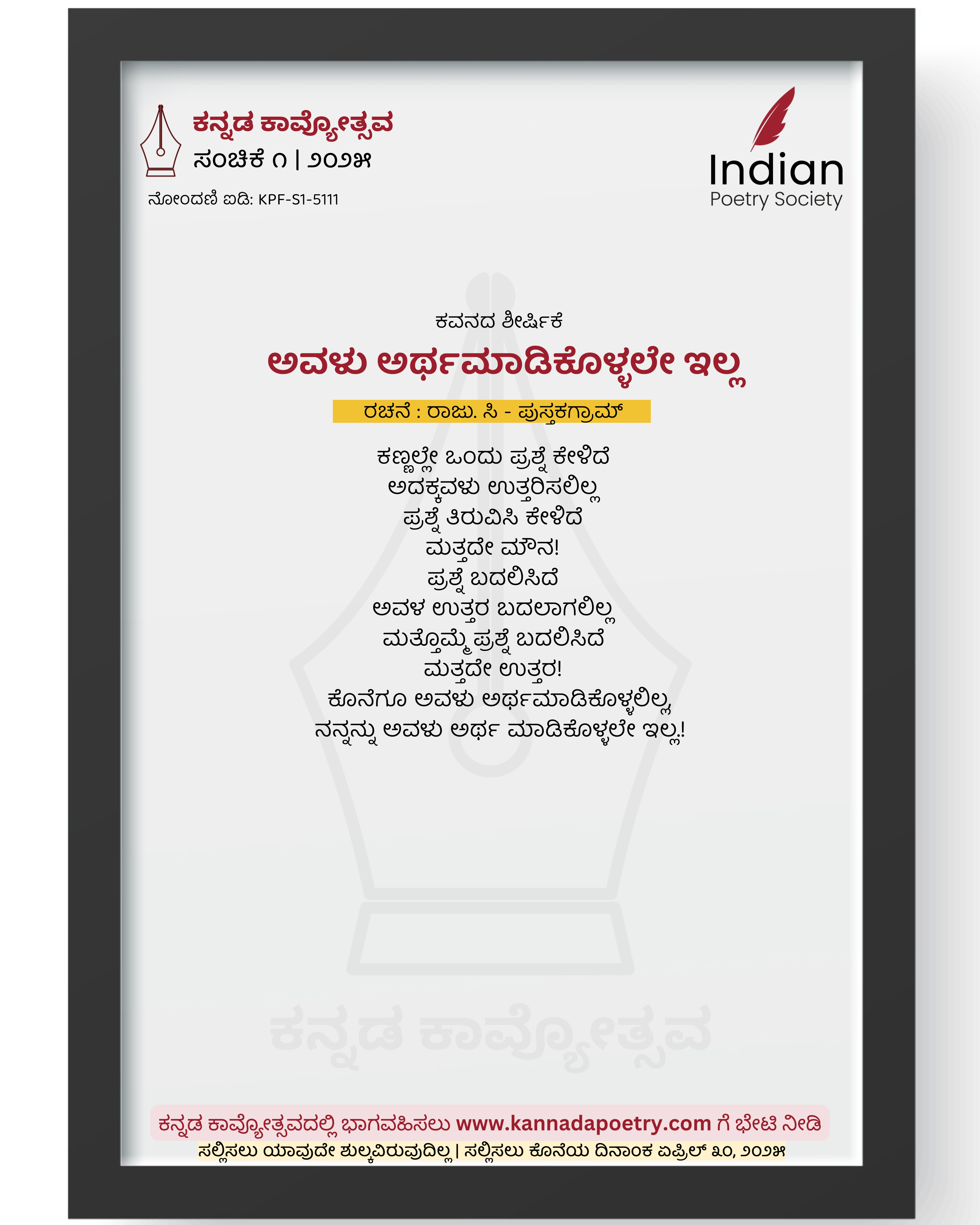 ಕಣ್ಣಲ್ಲೇ ಒಂದು ಪ್ರಶ್ನೆ ಕೇಳಿದೆ ಅದಕ್ಕವಳು ಉತ್ತರಿಸಲಿಲ್ಲ ಪ್ರಶ್ನೆ ತಿರುವಿಸಿ ಕೇಳಿದೆ ಮತ್ತದೇ ಮೌನ! ಪ್ರಶ್ನೆ ಬದಲಿಸಿದೆ ಅವಳ ಉತ್ತರ ಬದಲಾಗಲಿಲ್ಲ ಮತ್ತೊಮ್ಮೆ ಪ್ರಶ್ನೆ ಬದಲಿಸಿದೆ ಮತ್ತದೇ ಉತ್ತರ! ಕೊನೆಗೂ ಅವಳು ಅರ್ಥಮಾಡಿಕೊಳ್ಳಲಿಲ್ಲ, ನನ್ನನ್ನು ಅವಳು ಅರ್ಥ ಮಾಡಿಕೊಳ್ಳಲೇ ಇಲ್ಲ.!