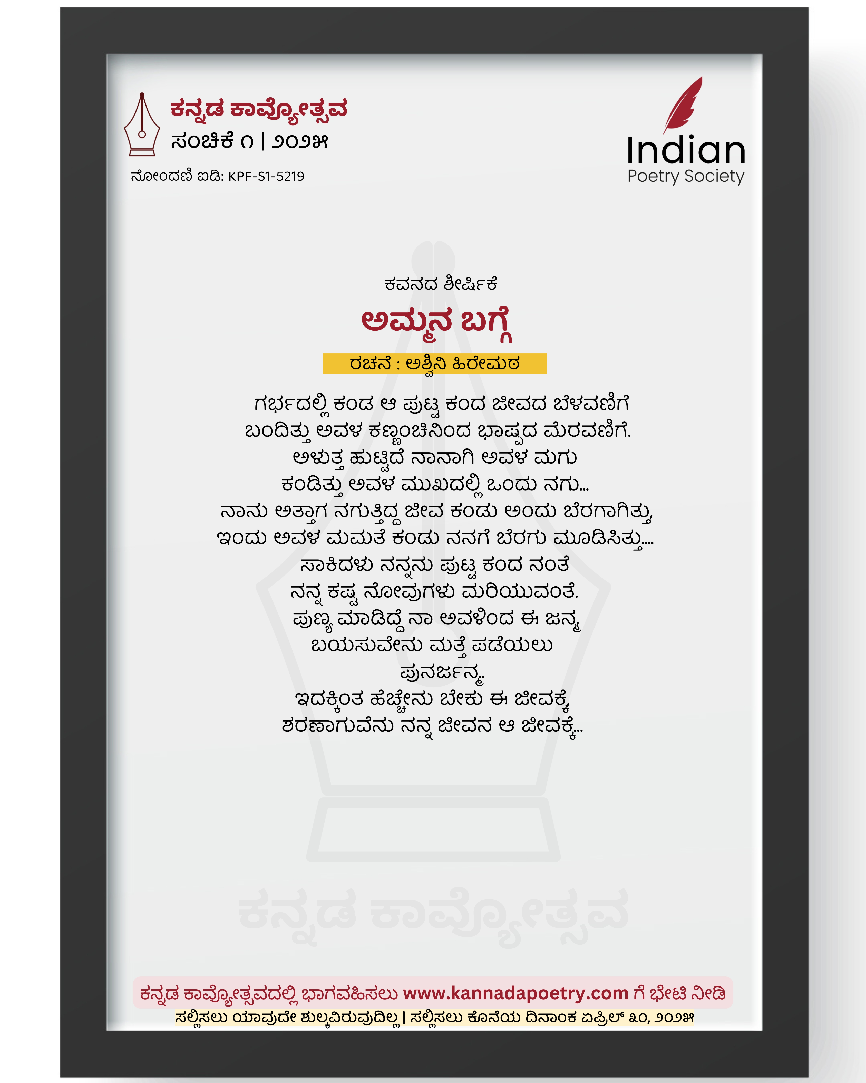 ಗರ್ಭದಲ್ಲಿ ಕಂಡ ಆ ಪುಟ್ಟ ಕಂದ ಜೀವದ ಬೆಳವಣಿಗೆ ಬಂದಿತ್ತು ಅವಳ ಕಣ್ಣಂಚಿನಿಂದ ಭಾಷ್ಪದ ಮೆರವಣಿಗೆ. ಅಳುತ್ತ ಹುಟ್ಟಿದೆ ನಾನಾಗಿ ಅವಳ ಮಗು ಕಂಡಿತ್ತು ಅವಳ ಮುಖದಲ್ಲಿ ಒಂದು ನಗು... ನಾನು ಅತ್ತಾಗ ನಗುತ್ತಿದ್ದ ಜೀವ ಕಂಡು ಅಂದು ಬೆರಗಾಗಿತ್ತು, ಇಂದು ಅವಳ ಮಮತೆ ಕಂಡು ನನಗೆ ಬೆರಗು ಮೂಡಿಸಿತ್ತು.... ಸಾಕಿದಳು ನನ್ನನು ಪುಟ್ಟ ಕಂದ ನಂತೆ ನನ್ನ ಕಷ್ಟ ನೋವುಗಳು ಮರಿಯುವಂತೆ. ಪುಣ್ಯ ಮಾಡಿದ್ದೆ ನಾ ಅವಳಿಂದ ಈ ಜನ್ಮ, ಬಯಸುವೇನು ಮತ್ತೆ ಪಡೆಯಲು ಪುನರ್ಜನ್ಮ.. ಇದಕ್ಕಿಂತ ಹೆಚ್ಚೇನು ಬೇಕು ಈ ಜೀವಕ್ಕೆ, ಶರಣಾಗುವೆನು ನನ್ನ ಜೀವನ ಆ ಜೀವಕ್ಕೆ...