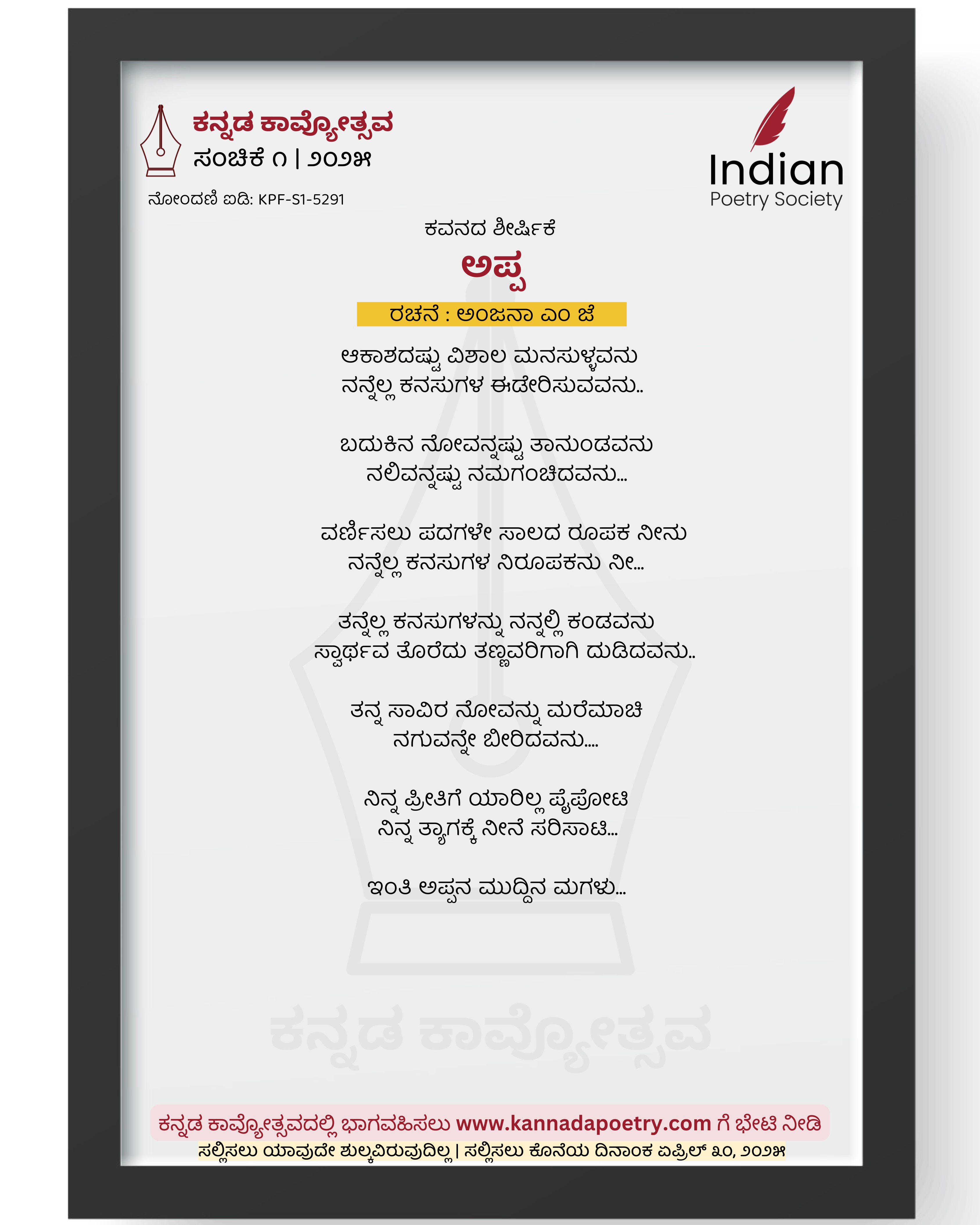 ಆಕಾಶದಷ್ಟು ವಿಶಾಲ ಮನಸುಳ್ಳವನು ನನ್ನೆಲ್ಲ ಕನಸುಗಳ ಈಡೇರಿಸುವವನು.. ಬದುಕಿನ ನೋವನ್ನಷ್ಟು ತಾನುಂಡವನು ನಲಿವನ್ನಷ್ಟು ನಮಗಂಚಿದವನು... ವರ್ಣಿಸಲು ಪದಗಳೇ ಸಾಲದ ರೂಪಕ ನೀನು ನನ್ನೆಲ್ಲ ಕನಸುಗಳ ನಿರೂಪಕನು ನೀ... ತನ್ನೆಲ್ಲ ಕನಸುಗಳನ್ನು ನನ್ನಲ್ಲಿ ಕಂಡವನು ಸ್ವಾರ್ಥವ ತೊರೆದು ತಣ್ಣವರಿಗಾಗಿ ದುಡಿದವನು.. ತನ್ನ ಸಾವಿರ ನೋವನ್ನು ಮರೆಮಾಚಿ ನಗುವನ್ನೇ ಬೀರಿದವನು.... ನಿನ್ನ ಪ್ರೀತಿಗೆ ಯಾರಿಲ್ಲ ಪೈಪೋಟಿ ನಿನ್ನ ತ್ಯಾಗಕ್ಕೆ ನೀನೆ ಸರಿಸಾಟಿ... ಇಂತಿ ಅಪ್ಪನ ಮುದ್ದಿನ ಮಗಳು...