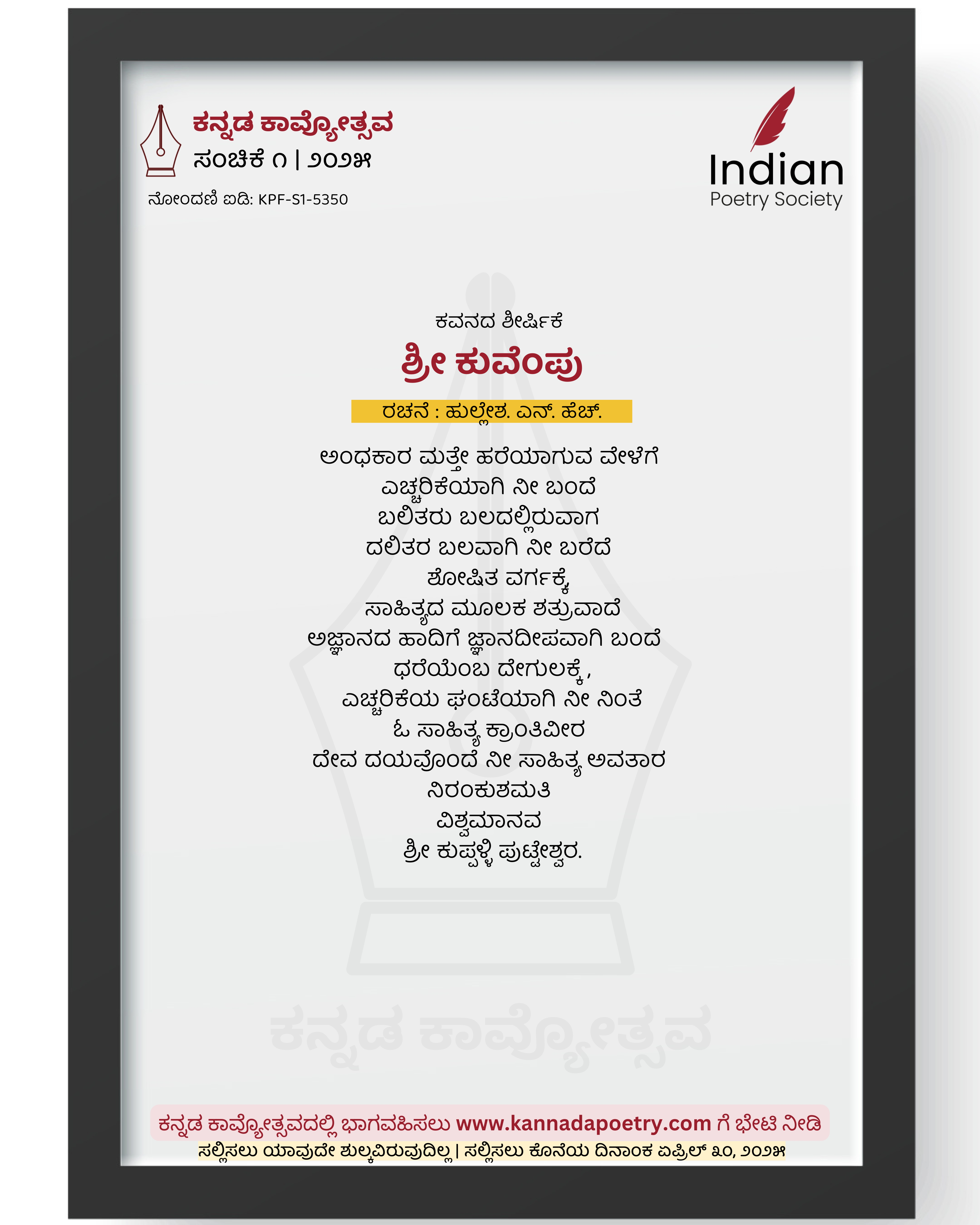 ಅಂಧಕಾರ ಮತ್ತೇ ಹರೆಯಾಗುವ ವೇಳೆಗೆ ಎಚ್ಚರಿಕೆಯಾಗಿ ನೀ ಬಂದೆ ಬಲಿತರು ಬಲದಲ್ಲಿರುವಾಗ ದಲಿತರ ಬಲವಾಗಿ ನೀ ಬರೆದೆ ಶೋಷಿತ ವರ್ಗಕ್ಕೆ, ಸಾಹಿತ್ಯದ ಮೂಲಕ ಶತ್ರುವಾದೆ ಅಜ್ಞಾನದ ಹಾದಿಗೆ ಜ್ಞಾನದೀಪವಾಗಿ ಬಂದೆ ಧರೆಯೆಂಬ ದೇಗುಲಕ್ಕೆ , ಎಚ್ಚರಿಕೆಯ ಘಂಟೆಯಾಗಿ ನೀ ನಿಂತೆ ಓ ಸಾಹಿತ್ಯ ಕ್ರಾಂತಿವೀರ ದೇವ ದಯವೊಂದೆ ನೀ ಸಾಹಿತ್ಯ ಅವತಾರ ನಿರಂಕುಶಮತಿ ವಿಶ್ವಮಾನವ ಶ್ರೀ ಕುಪ್ಪಳ್ಳಿ ಪುಟ್ಟೇಶ್ವರ.