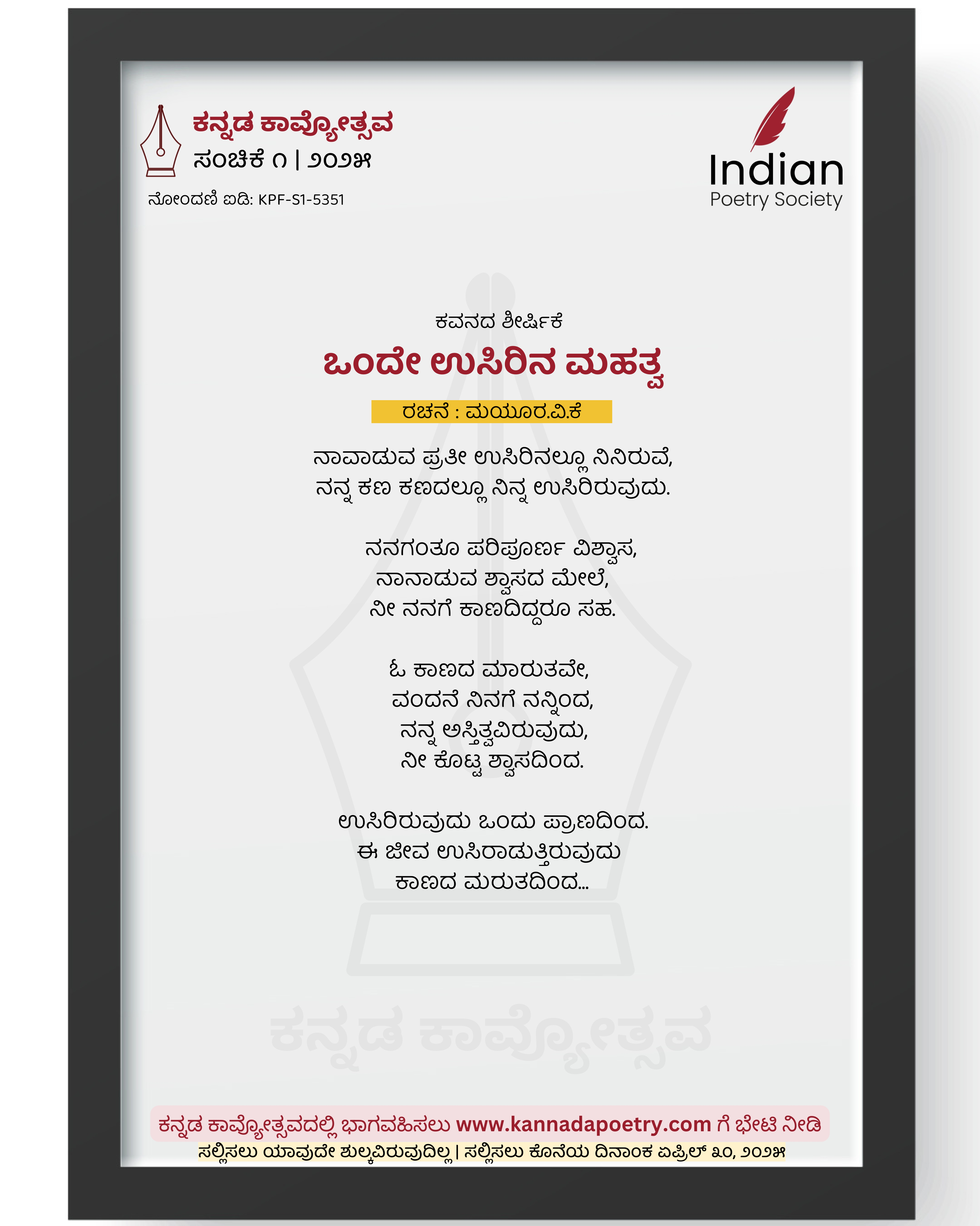 ನಾವಾಡುವ ಪ್ರತೀ ಉಸಿರಿನಲ್ಲೂ ನಿನಿರುವೆ, ನನ್ನ ಕಣ ಕಣದಲ್ಲೂ ನಿನ್ನ ಉಸಿರಿರುವುದು. ನನಗಂತೂ ಪರಿಪೂರ್ಣ ವಿಶ್ವಾಸ, ನಾನಾಡುವ ಶ್ವಾಸದ ಮೇಲೆ, ನೀ ನನಗೆ ಕಾಣದಿದ್ದರೂ ಸಹ. ಓ ಕಾಣದ ಮಾರುತವೇ, ವಂದನೆ ನಿನಗೆ ನನ್ನಿಂದ, ನನ್ನ ಅಸ್ತಿತ್ವವಿರುವುದು, ನೀ ಕೊಟ್ಟ ಶ್ವಾಸದಿಂದ. ಉಸಿರಿರುವುದು ಒಂದು ಪ್ರಾಣದಿಂದ. ಈ ಜೀವ ಉಸಿರಾಡುತ್ತಿರುವುದು ಕಾಣದ ಮರುತದಿಂದ...