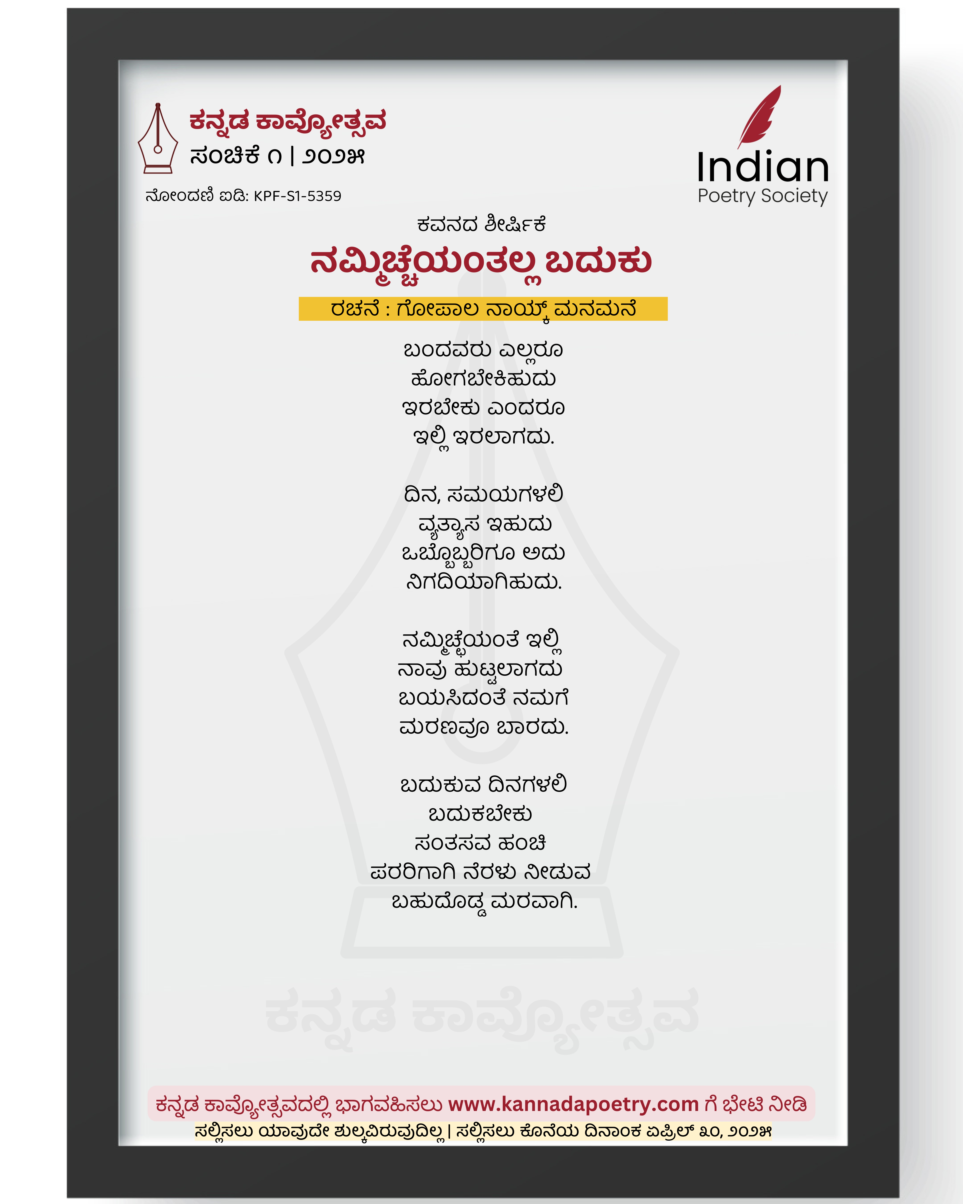 ಬಂದವರು ಎಲ್ಲರೂ ಹೋಗಬೇಕಿಹುದು ಇರಬೇಕು ಎಂದರೂ ಇಲ್ಲಿ ಇರಲಾಗದು. ದಿನ, ಸಮಯಗಳಲಿ ವ್ಯತ್ಯಾಸ ಇಹುದು ಒಬ್ಬೊಬ್ಬರಿಗೂ ಅದು ನಿಗದಿಯಾಗಿಹುದು. ನಮ್ಮಿಚ್ಛೆಯಂತೆ ಇಲ್ಲಿ ನಾವು ಹುಟ್ಟಲಾಗದು ಬಯಸಿದಂತೆ ನಮಗೆ ಮರಣವೂ ಬಾರದು. ಬದುಕುವ ದಿನಗಳಲಿ ಬದುಕಬೇಕು ಸಂತಸವ ಹಂಚಿ ಪರರಿಗಾಗಿ ನೆರಳು ನೀಡುವ ಬಹುದೊಡ್ಡ ಮರವಾಗಿ.
