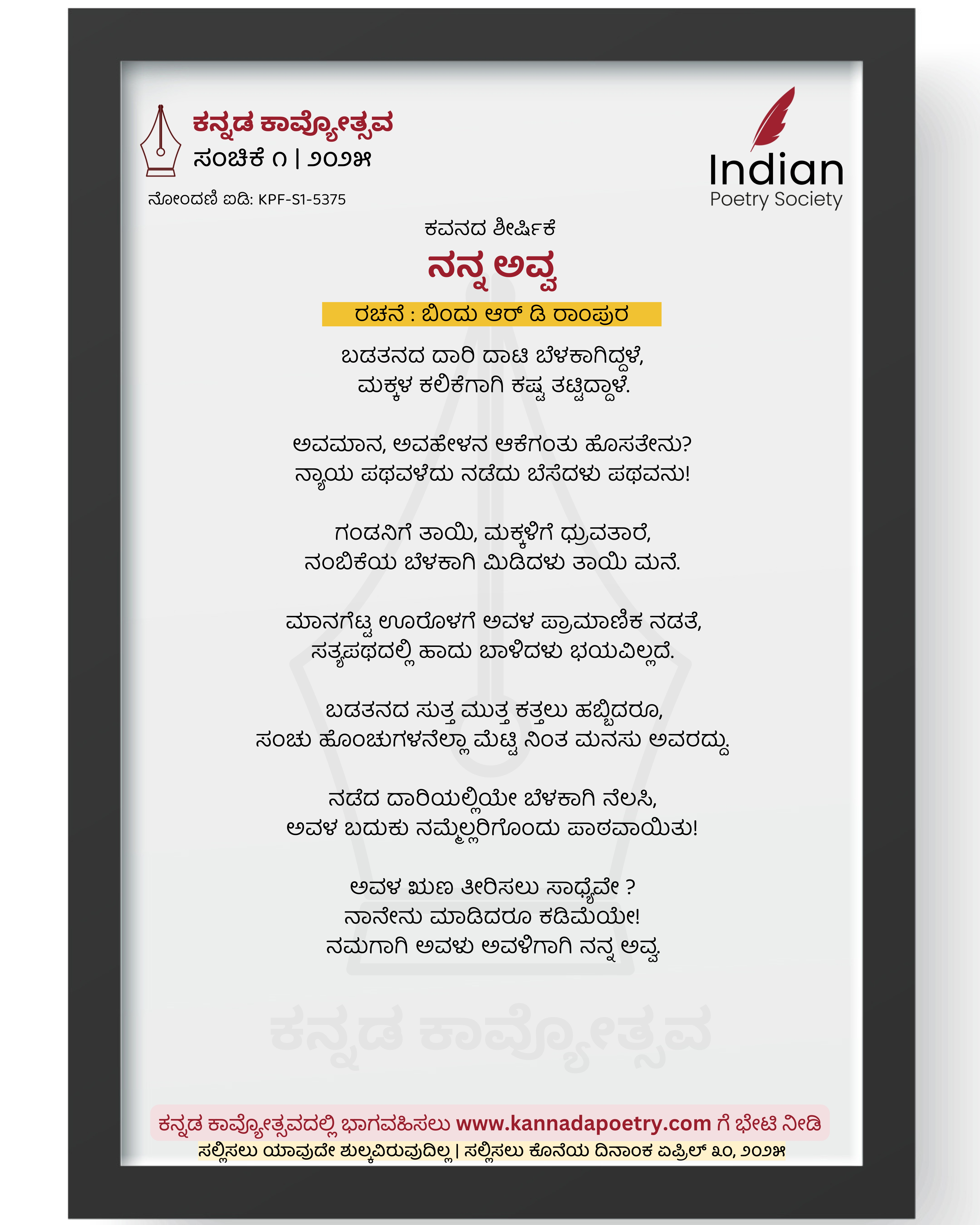 ಬಡತನದ ದಾರಿ ದಾಟಿ ಬೆಳಕಾಗಿದ್ದಳೆ, ಮಕ್ಕಳ ಕಲಿಕೆಗಾಗಿ ಕಷ್ಟ ತಟ್ಟಿದ್ದಾಳೆ. ಅವಮಾನ, ಅವಹೇಳನ ಆಕೆಗಂತು ಹೊಸತೇನು? ನ್ಯಾಯ ಪಥವಳೆದು ನಡೆದು ಬೆಸೆದಳು ಪಥವನು! ಗಂಡನಿಗೆ ತಾಯಿ, ಮಕ್ಕಳಿಗೆ ಧ್ರುವತಾರೆ, ನಂಬಿಕೆಯ ಬೆಳಕಾಗಿ ಮಿಡಿದಳು ತಾಯಿ ಮನೆ. ಮಾನಗೆಟ್ಟ ಊರೊಳಗೆ ಅವಳ ಪ್ರಾಮಾಣಿಕ ನಡತೆ, ಸತ್ಯಪಥದಲ್ಲಿ ಹಾದು ಬಾಳಿದಳು ಭಯವಿಲ್ಲದೆ. ಬಡತನದ ಸುತ್ತ ಮುತ್ತ ಕತ್ತಲು ಹಬ್ಬಿದರೂ, ಸಂಚು ಹೊಂಚುಗಳನೆಲ್ಲಾ ಮೆಟ್ಟಿ ನಿಂತ ಮನಸು ಅವರದ್ದು. ನಡೆದ ದಾರಿಯಲ್ಲಿಯೇ ಬೆಳಕಾಗಿ ನೆಲಸಿ, ಅವಳ ಬದುಕು ನಮ್ಮೆಲ್ಲರಿಗೊಂದು ಪಾಠವಾಯಿತು! ಅವಳ ಋಣ ತೀರಿಸಲು ಸಾಧ್ಯೆವೇ ? ನಾನೇನು ಮಾಡಿದರೂ ಕಡಿಮೆಯೇ! ನಮಗಾಗಿ ಅವಳು ಅವಳಿಗಾಗಿ ನನ್ನ ಅವ್ವ.