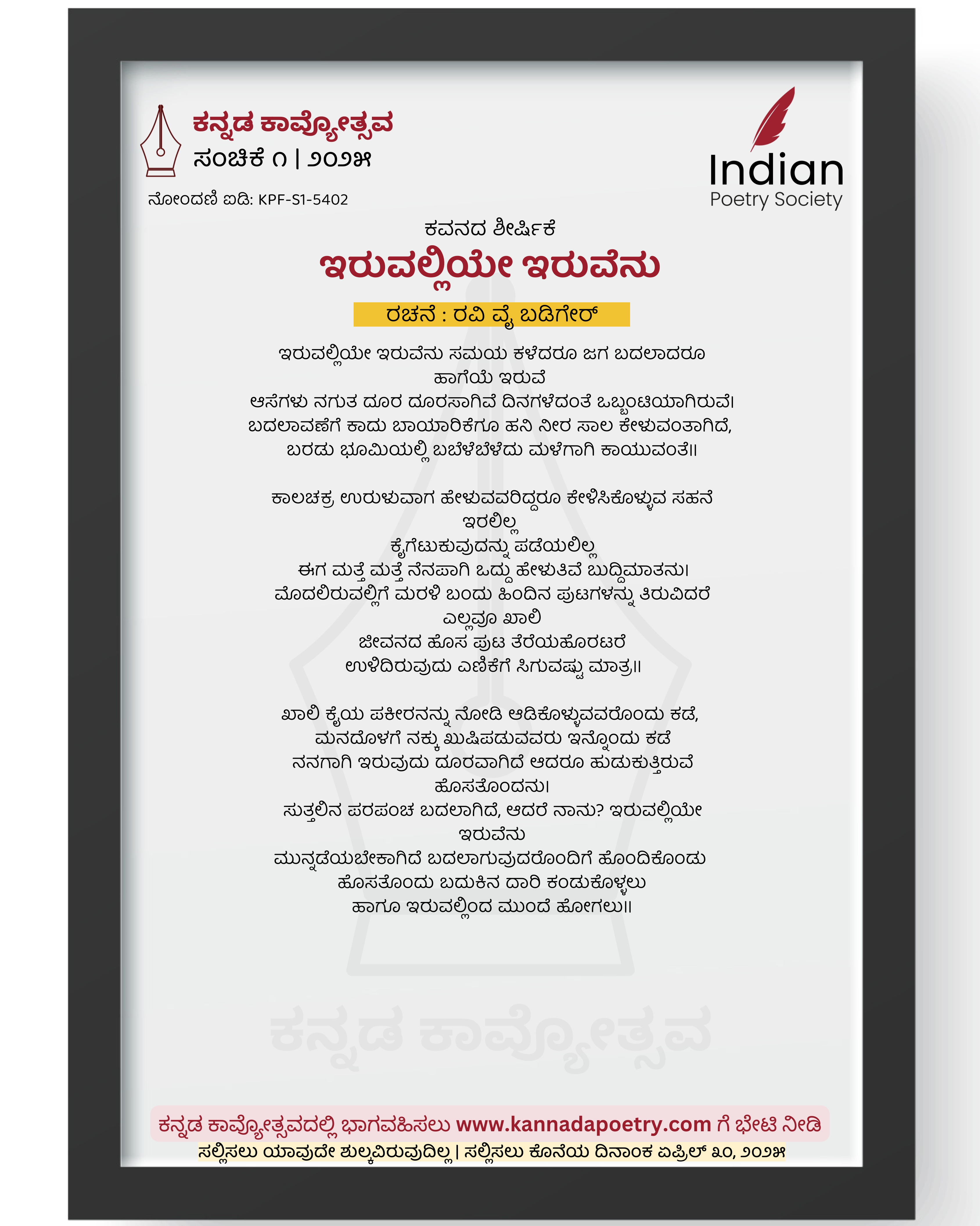 ಇರುವಲ್ಲಿಯೇ ಇರುವೆನು ಸಮಯ ಕಳೆದರೂ ಜಗ ಬದಲಾದರೂ ಹಾಗೆಯೆ ಇರುವೆ ಆಸೆಗಳು ನಗುತ ದೂರ ದೂರಸಾಗಿವೆ ದಿನಗಳೆದಂತೆ ಒಬ್ಬಂಟಿಯಾಗಿರುವೆ। ಬದಲಾವಣೆಗೆ ಕಾದು ಬಾಯಾರಿಕೆಗೂ ಹನಿ ನೀರ ಸಾಲ ಕೇಳುವಂತಾಗಿದೆ, ಬರಡು ಭೂಮಿಯಲ್ಲಿ ಬಬೆಳೆಬೆಳೆದು ಮಳೆಗಾಗಿ ಕಾಯುವಂತೆ॥ ಕಾಲಚಕ್ರ ಉರುಳುವಾಗ ಹೇಳುವವರಿದ್ದರೂ ಕೇಳಿಸಿಕೊಳ್ಳುವ ಸಹನೆ ಇರಲಿಲ್ಲ ಕೈಗೆಟುಕುವುದನ್ನು ಪಡೆಯಲಿಲ್ಲ ಈಗ ಮತ್ತೆ ಮತ್ತೆ ನೆನಪಾಗಿ ಒದ್ದು ಹೇಳುತಿವೆ ಬುದ್ದಿಮಾತನು। ಮೊದಲಿರುವಲ್ಲಿಗೆ ಮರಳಿ ಬಂದು ಹಿಂದಿನ ಪುಟಗಳನ್ನು ತಿರುವಿದರೆ ಎಲ್ಲವೂ ಖಾಲಿ ಜೀವನದ ಹೊಸ ಪುಟ ತೆರೆಯಹೊರಟರೆ ಉಳಿದಿರುವುದು ಎಣಿಕೆಗೆ ಸಿಗುವಷ್ಟು ಮಾತ್ರ॥ ಖಾಲಿ ಕೈಯ ಪಕೀರನನ್ನು ನೋಡಿ ಆಡಿಕೊಳ್ಳುವವರೊಂದು ಕಡೆ, ಮನದೊಳಗೆ ನಕ್ಕು ಖುಷಿಪಡುವವರು ಇನ್ನೊಂದು ಕಡೆ ನನಗಾಗಿ ಇರುವುದು ದೂರವಾಗಿದೆ ಆದರೂ ಹುಡುಕುತ್ತಿರುವೆ ಹೊಸತೊಂದನು। ಸುತ್ತಲಿನ ಪರಪಂಚ ಬದಲಾಗಿದೆ, ಆದರೆ ನಾನು? ಇರುವಲ್ಲಿಯೇ ಇರುವೆನು ಮುನ್ನಡೆಯಬೇಕಾಗಿದೆ ಬದಲಾಗುವುದರೊಂದಿಗೆ ಹೊಂದಿಕೊಂಡು ಹೊಸತೊಂದು ಬದುಕಿನ ದಾರಿ ಕಂಡುಕೊಳ್ಳಲು ಹಾಗೂ ಇರುವಲ್ಲಿಂದ ಮುಂದೆ ಹೋಗಲು॥