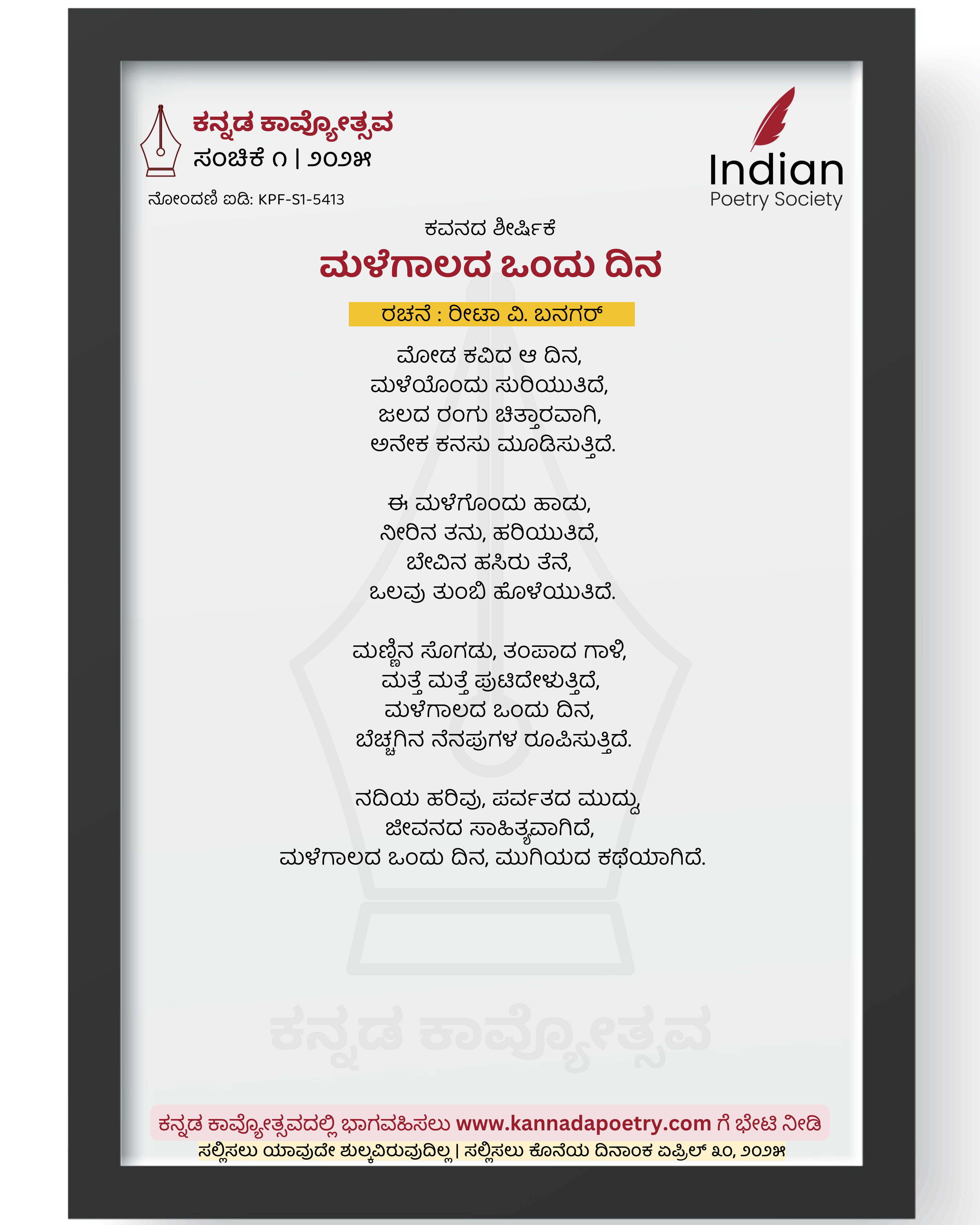 ಮೋಡ ಕವಿದ ಆ ದಿನ, ಮಳೆಯೊಂದು ಸುರಿಯುತಿದೆ, ಜಲದ ರಂಗು ಚಿತ್ತಾರವಾಗಿ, ಅನೇಕ ಕನಸು ಮೂಡಿಸುತ್ತಿದೆ. ಈ ಮಳೆಗೊಂದು ಹಾಡು, ನೀರಿನ ತನು, ಹರಿಯುತಿದೆ, ಬೇವಿನ ಹಸಿರು ತೆನೆ, ಒಲವು ತುಂಬಿ ಹೊಳೆಯುತಿದೆ. ಮಣ್ಣಿನ ಸೊಗಡು, ತಂಪಾದ ಗಾಳಿ, ಮತ್ತೆ ಮತ್ತೆ ಪುಟಿದೇಳುತ್ತಿದೆ, ಮಳೆಗಾಲದ ಒಂದು ದಿನ, ಬೆಚ್ಚಗಿನ ನೆನಪುಗಳ ರೂಪಿಸುತ್ತಿದೆ. ನದಿಯ ಹರಿವು, ಪರ್ವತದ ಮುದ್ದು, ಜೀವನದ ಸಾಹಿತ್ಯವಾಗಿದೆ, ಮಳೆಗಾಲದ ಒಂದು ದಿನ, ಮುಗಿಯದ ಕಥೆಯಾಗಿದೆ.